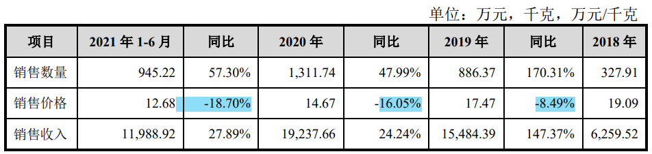 报告期内,虽然莱特光电OLED终端材料的销售数量和销售收入不断增长,但这是价格持续走低的情况下进行的,销售价格从2018年的10.09万元/千克一路降至2021年1-6月的12.68万元/千克。