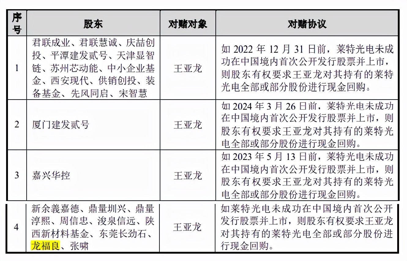 莱特光电如果未能成功在中国境内首次公开发行股票并上市,则投资方有权要求王亚龙对投资方持有的莱特光电全部或部分股份进行现金回购。上述回购权自莱特光电向上海证券交易所递交首次公开发行股票并上市申请材料之日起终止,若莱特光电未能实现股票公开发行并上市流通,投资方享有的回购权自动恢复。
