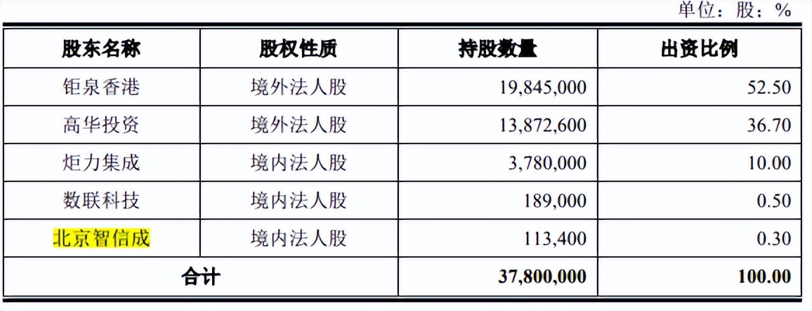 2010年3月25日股改时,北京智信成持有113,400股公司股权,占比0.30%,本次整体改制后,钜泉光电的股本结构为: