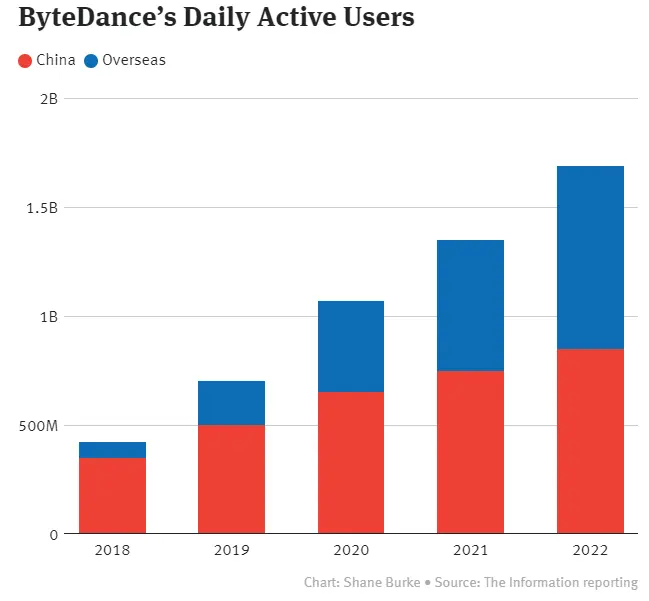 据报道,截至2022年底,字节跳动在中国以外的日活用户已达到8.4亿,比去年同期增长了40%,2022年字节在中国的日活用户为8.5亿,同比增长了13%。