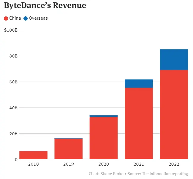 字节跳动的海外收入主要来自TikTok,也包括视频游戏和企业软件等其他的国际业务。该公司2022年的海外收入增至160亿美元,而2021年为65亿美元,2020年仅为12亿美元。