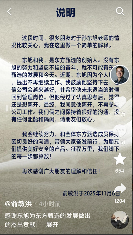 11月6日下午,新东方创始人俞敏洪在个人社交媒体账号发文,确认了前东方甄选CEO孙东旭的离职。